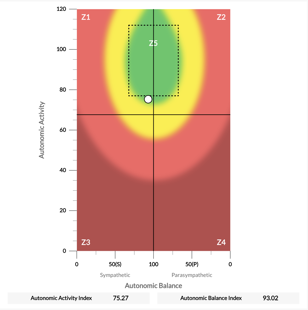 This is the big picture scan. HRV measures how well your autonomic nervous system is adapting to stress and tells us the overall charge level of your nervous system battery. A healthy nervous system is an adaptable one. It should be able to ramp up when you need it and settle down when you don't. When that flexibility is compromised, it shows up here.